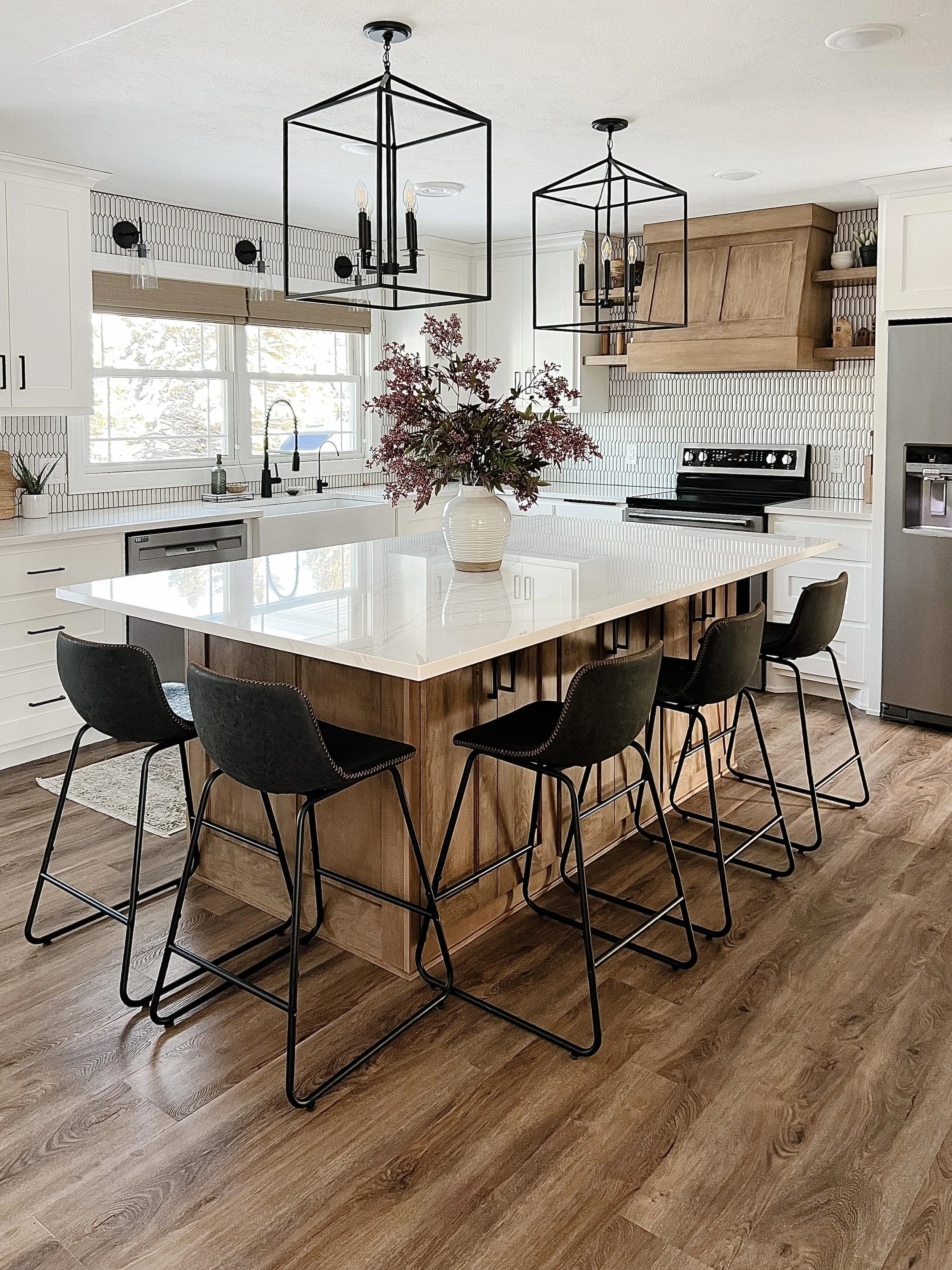 A modern farmhouse kitchen remodel, with warm floors and wooden accents, crisp white perimeter cabinets, matte black accents, and a fun textural backsplash.